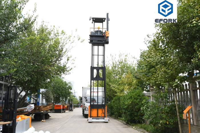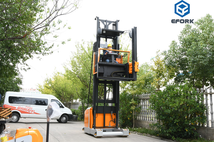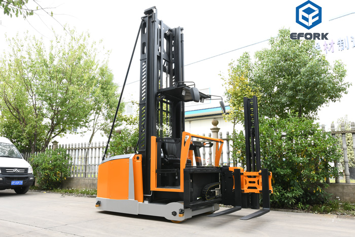 The three-way stacker forklift has a powerful high-position operation performance. The rated load and lifting height can be customized according to customer needs, rated load of 1500KG, with the highest lifting height reaching 14.5 meters, meeting the stacking requirements of goods on high-position racks. The design of the operator following the forklift up allows the operator to have a panoramic view and pick goods manually while stacking, realizing the dual function of the stacker forklift and effectively improving operation efficiency.
